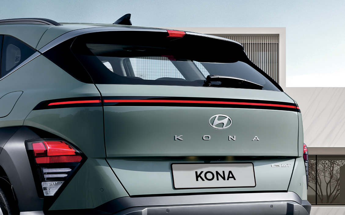 À l'instar de la face avant, un bandeau lumineux traverse le hayon de part en part. Le nouveau KONA reste fidèle à son ADN et conserve les éléments de style qui lui sont propres avec les feux de stop et de recul ainsi que les clignotants positionnés sur les côtés du pare-chocs arrière.