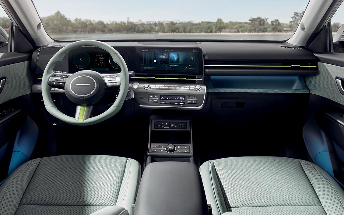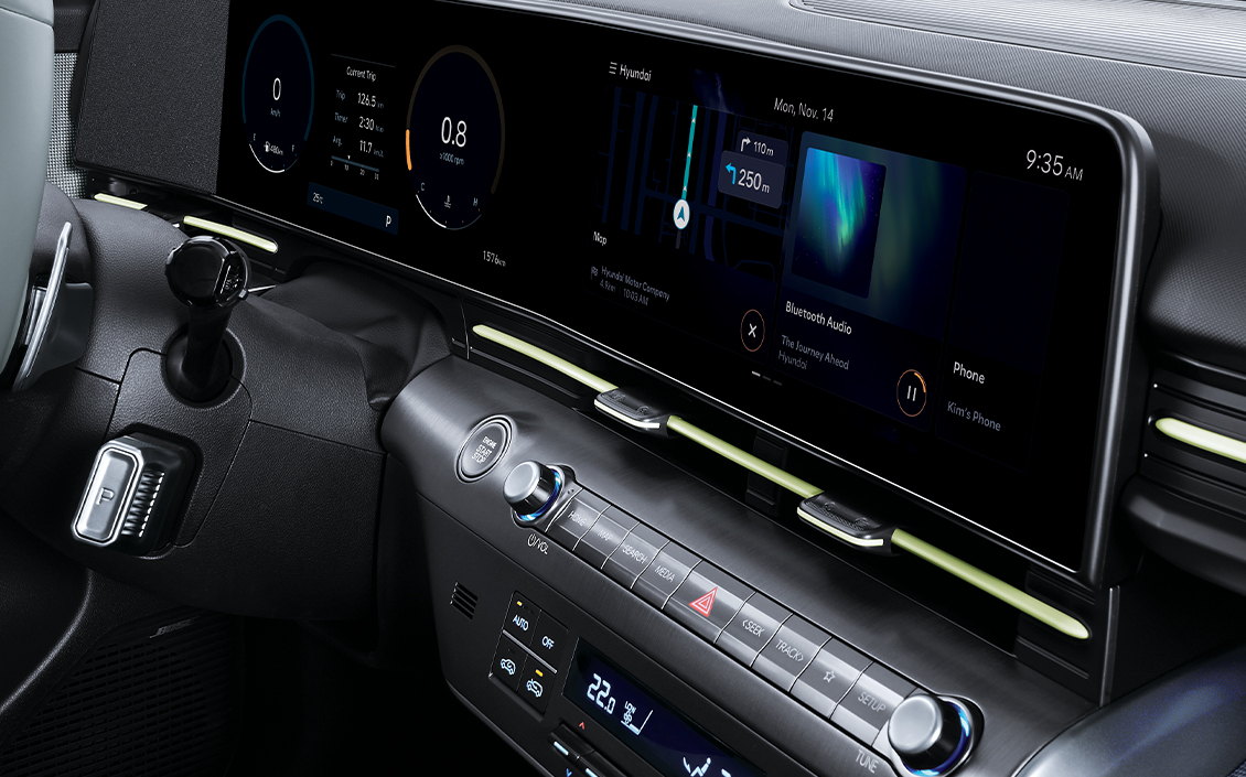 Voyez les choses à grand à bord du nouveau KONA grâce à l'affichage panoramique en double écran 12,3''. Élément central de la planche de bord, ce nouvel affichage regroupe les compteurs numériques et l'écran tactile où est centralisé l'ensemble du système d'infodivertissement.